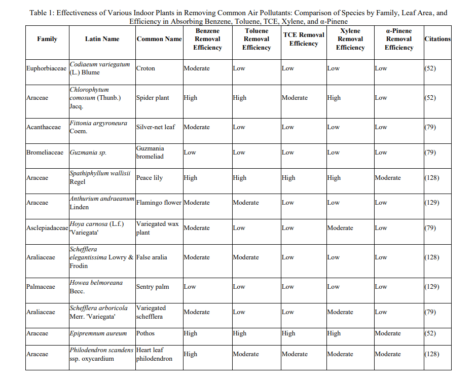 It’s a known fact that plants take in carbon dioxide and give off oxygen, but their relationship with surrounding air is a lot more complex. Aside from releasing oxygen and increasing humidity into the air around us, our plant friends also remove and metabolize indoor toxins. While most plants have this function, some plants are more effective than others depending on the toxic compound floating around. Spider plants, for example, are highly effective at absorbing benzene, toluene, and xylene, as shown in Table 1 below. This study highlights some other plants that are known to remove other compounds. Be sure to peruse the article further. Do you have any of the listed plants in your collection?